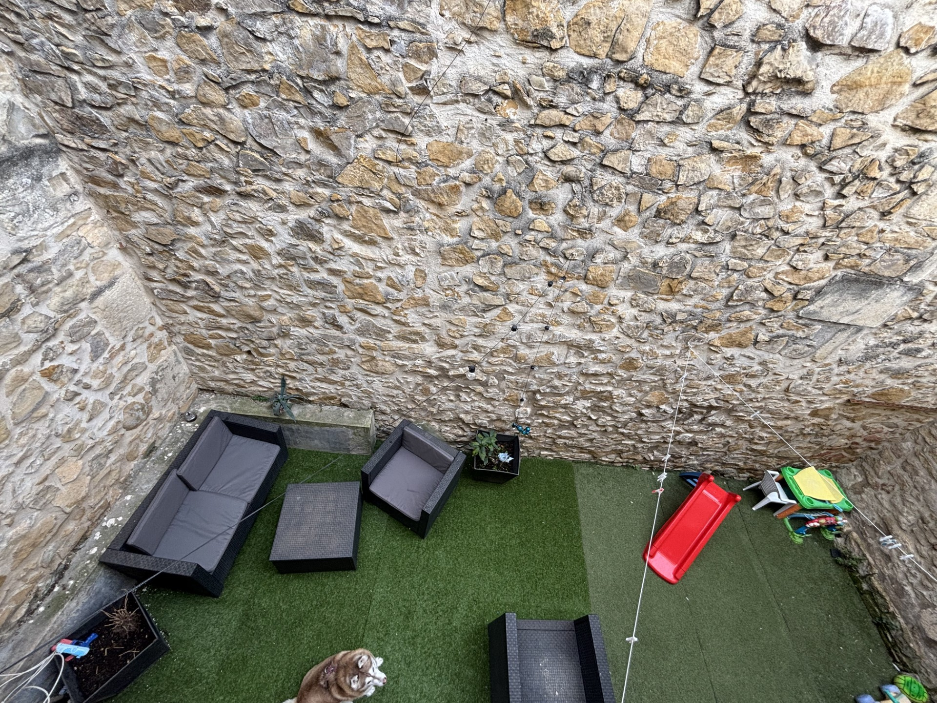 Le rez-de-chaussée se compose d’une grande pièce de vie lumineuse, ouverte sur une cour intimiste. L’ensemble est sublimé par des matériaux de caractère : pierres apparentes, poutres et larges ouvertures vitrées.