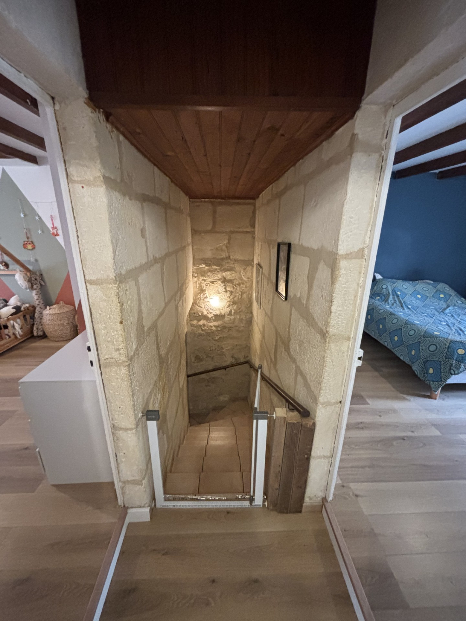 Le rez-de-chaussée propose une vaste pièce de vie baignée de lumière, donnant directement sur une cour intimiste, idéale pour profiter des beaux jours. Les murs en pierre, les poutres apparentes et les larges baies vitrées apportent un cachet indéniable à l’ensemble.