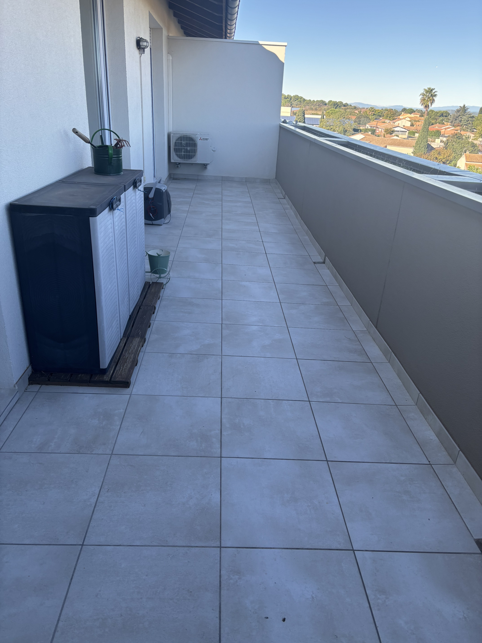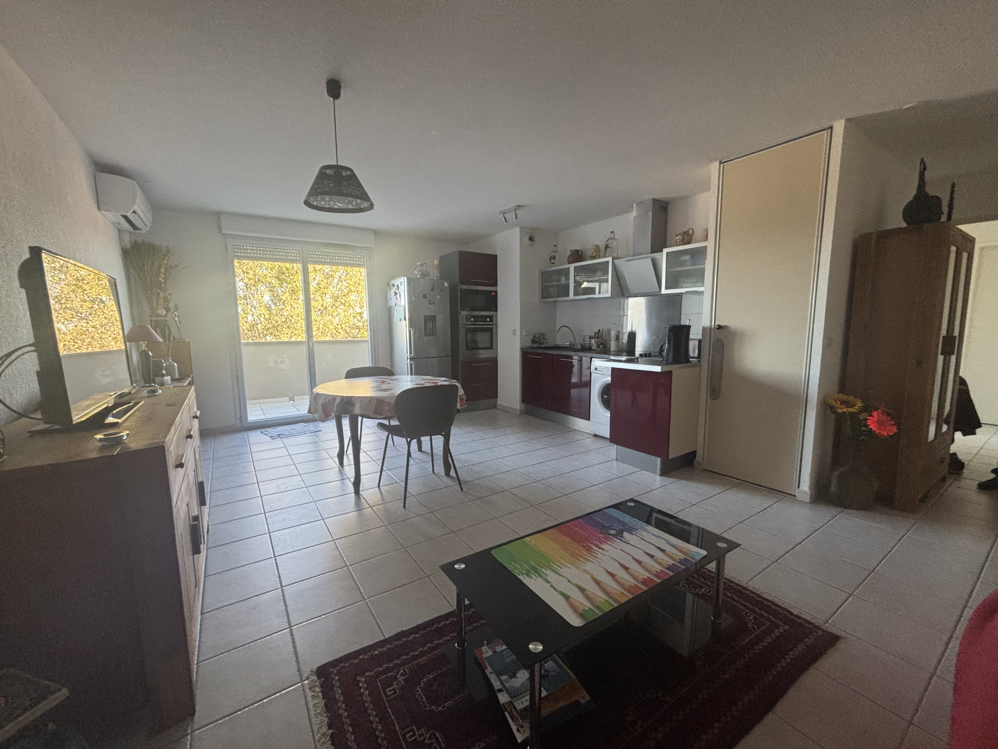 Le séjour climatisé s’ouvre sur une grande terrasse de 20 m², un véritable espace de vie extérieur pour vos repas, vos moments de détente ou vos soirées d’été.