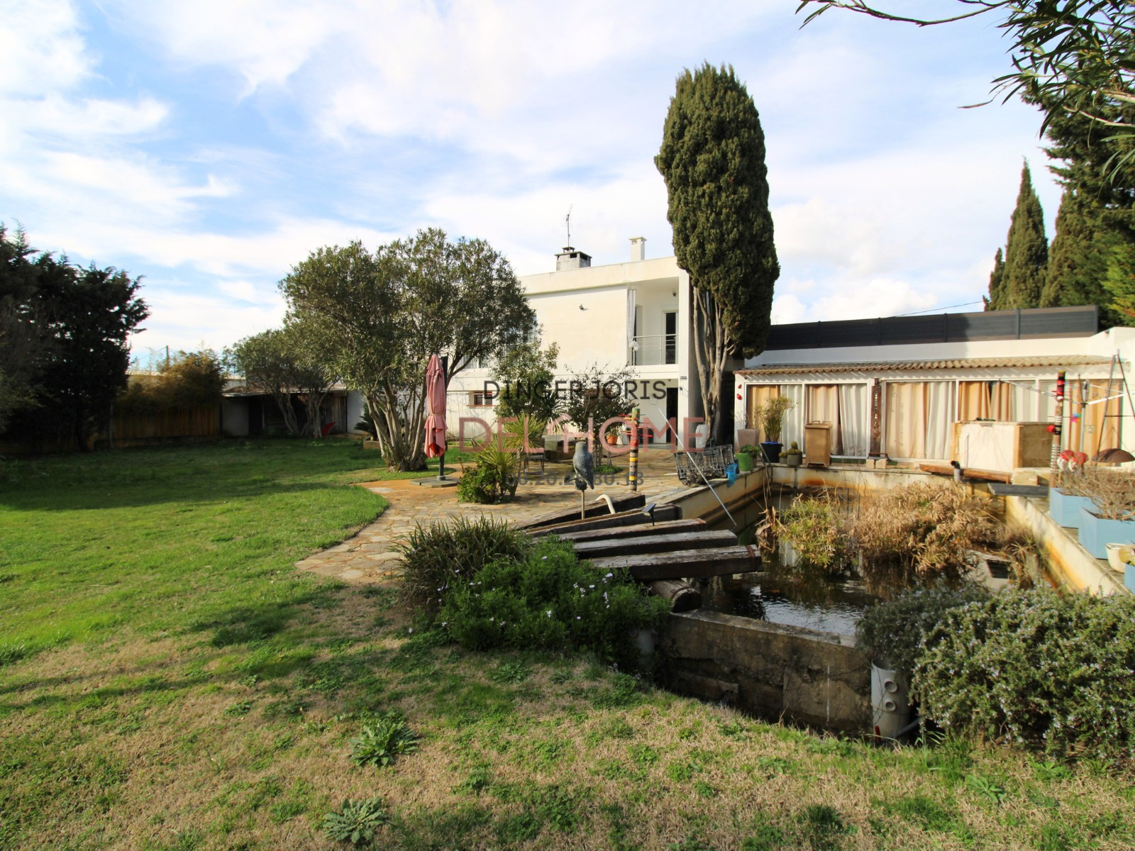 À l’extérieur, la terrasse s’ouvre sur le jardin arboré, ponctué d’un bassin d’agrément, créant un cadre propice à la détente et aux moments partagés.