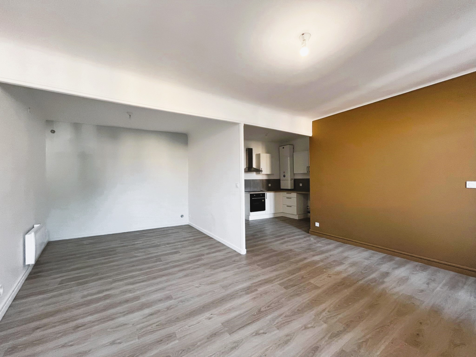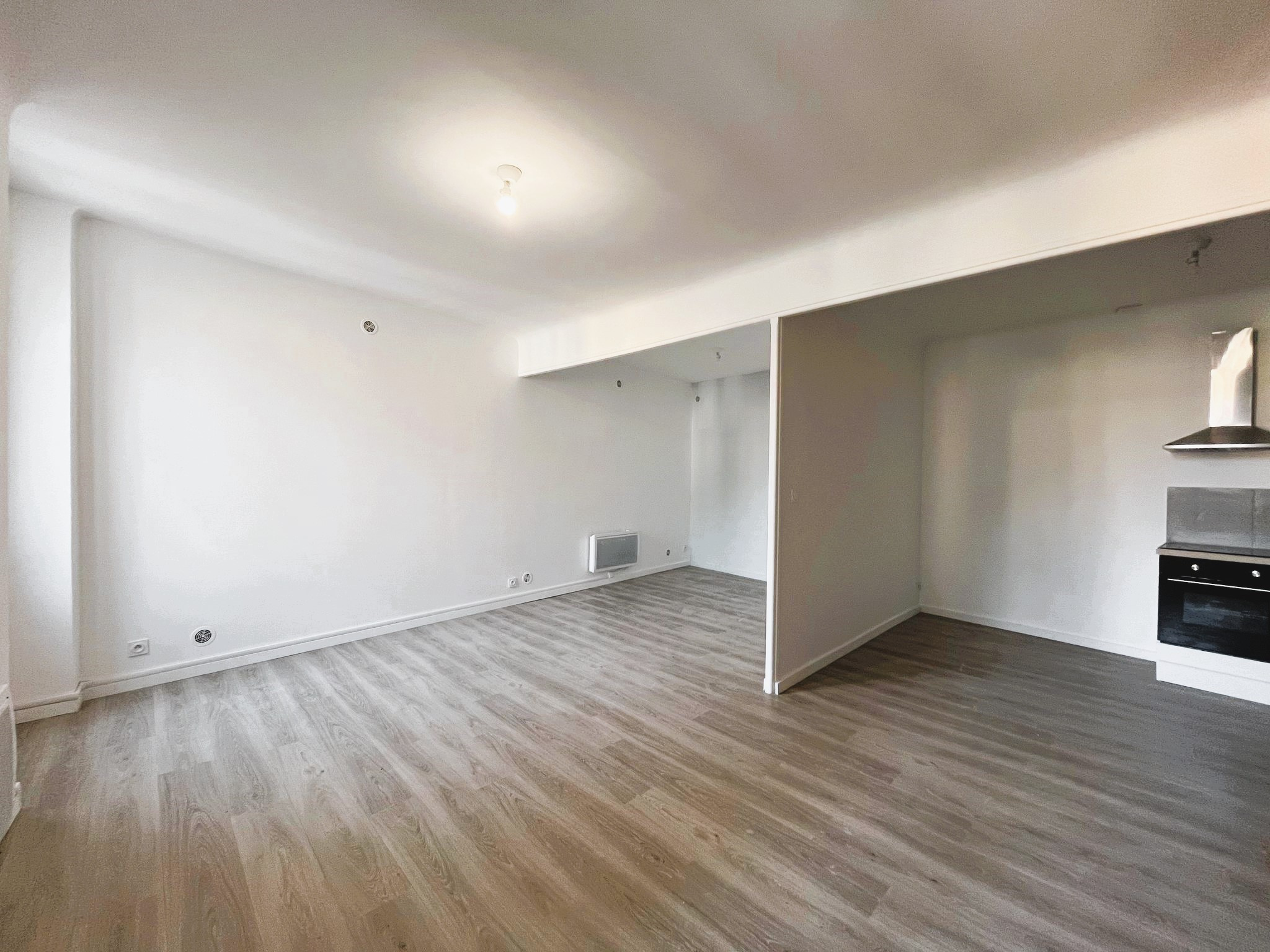 En centre ville, un grand studio au 1er étage d'un petit immeuble, totalement rénové, comprenant une cuisine aménagée et équipée (hotte, plaque, four) ouverte sur le séjour, possibilité de faire un coin nuit séparé.