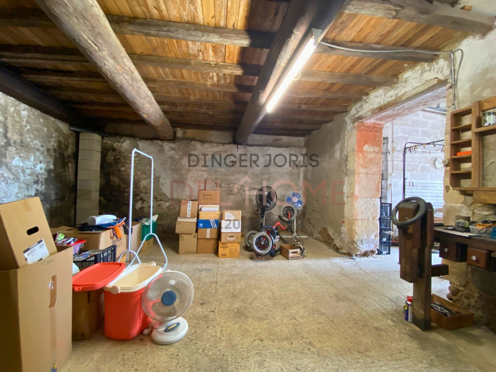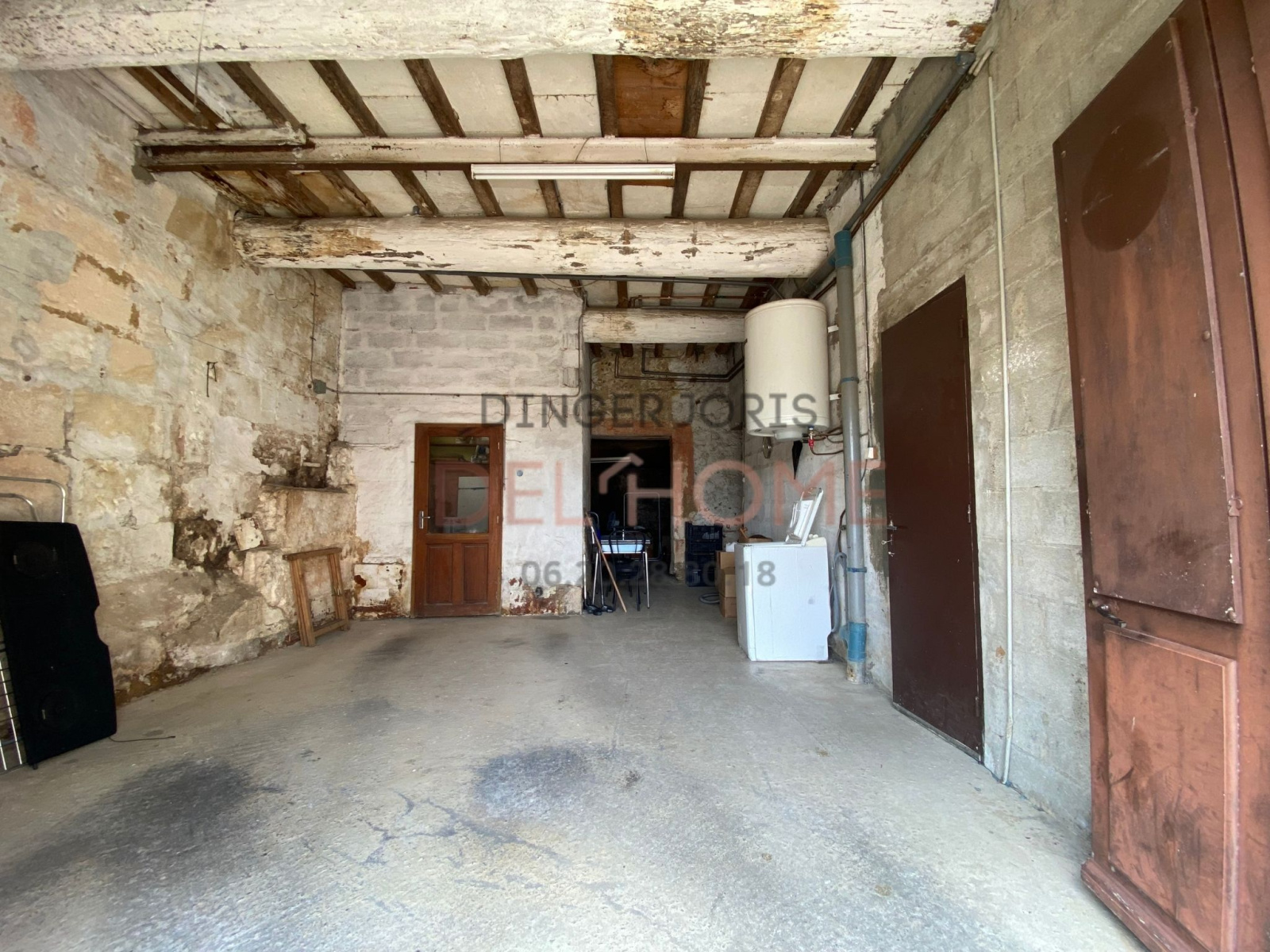 En rez-de-chaussée : grand garage de 70 m² avec porte de garage et accès direct à l’entrée de la maison.