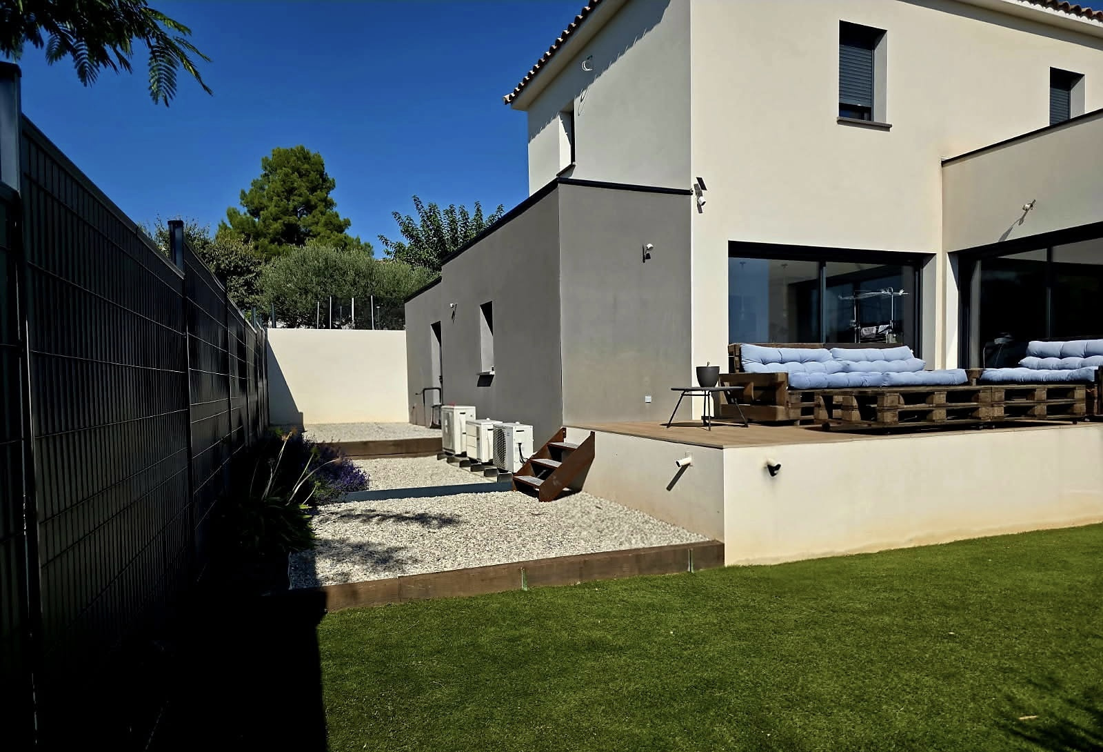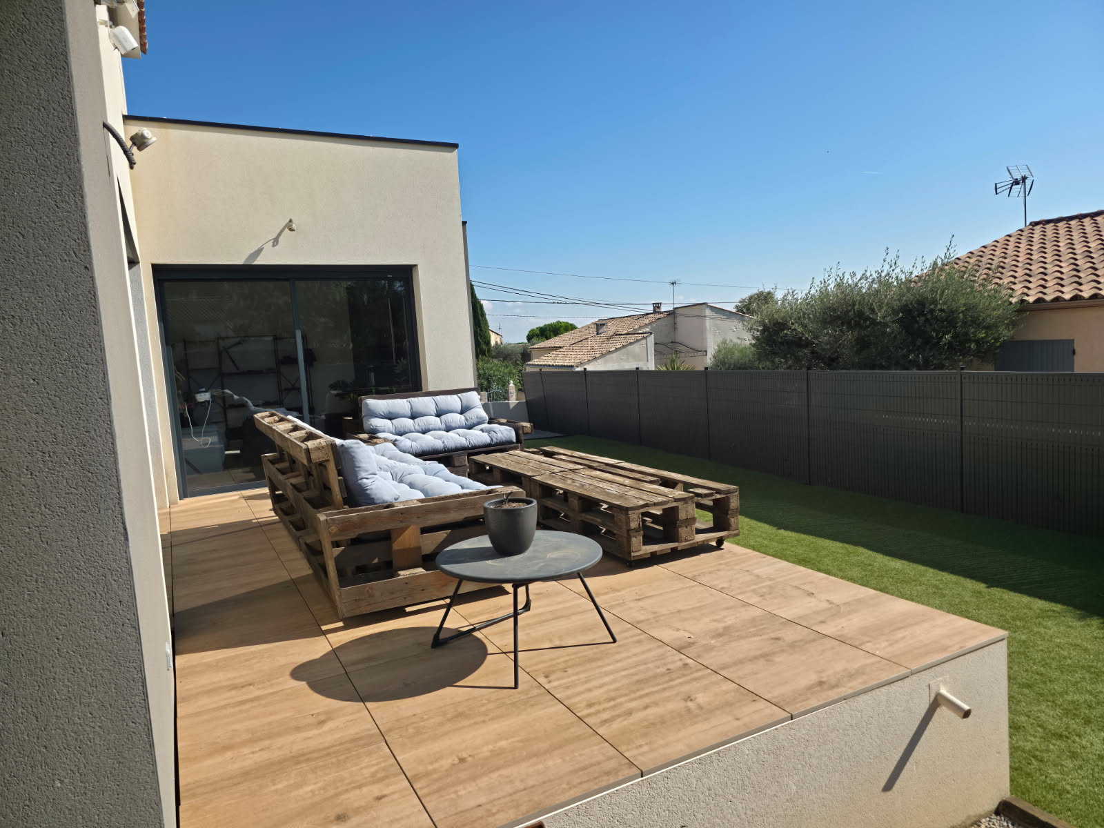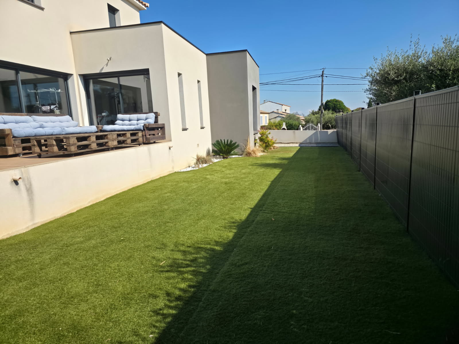L’extérieur invite à la détente avec une terrasse conviviale en dalle pierre/faux bois et un jardin parfaitement entretenu avec pelouse synthétique.